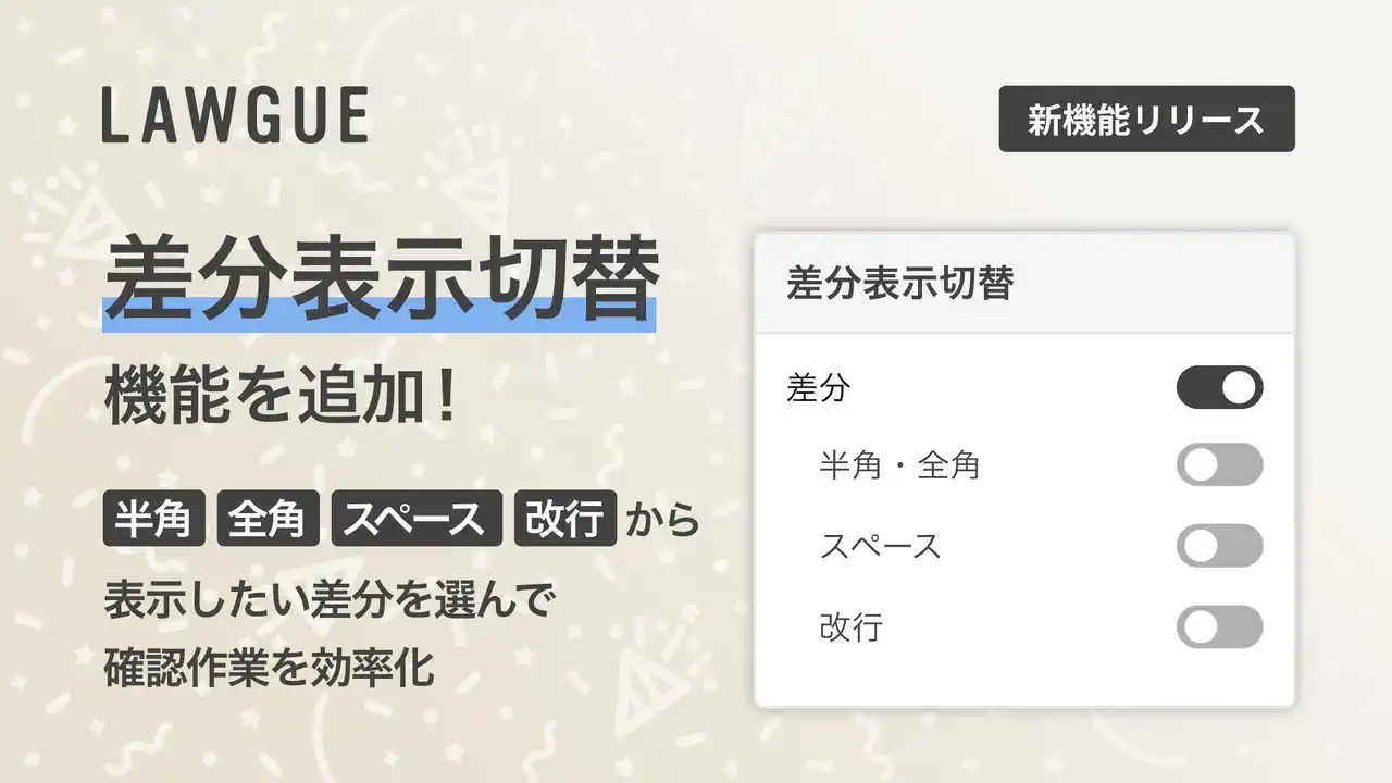 「LAWGUE」の差分表示において、「表示差分切替」タブより「半角・全角」「スペース」「改行」の「ON/OFF」を選択することで、目的に合わせたカスタマイズが可能です。 |