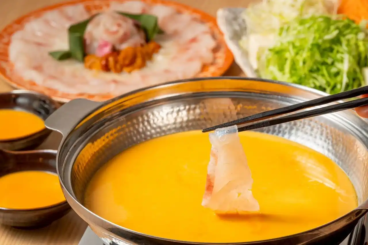 | コースの主役となるのはは、「桜鯛のウニしゃぶ」。さっと火を通した桜鯛に、濃厚なウニのコクが絡み合い、口の中でとろけるような味わいを楽しめます。ウニの旨味が溶け込んだ出汁は、〆にリゾットとしてご提供。最後の一口まで余すことなくお楽しみください。 | |||||||||