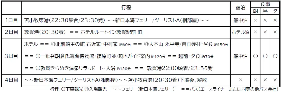 旅行代金に含まれるもの 新日本海フェリー往復乗船代(基本:ツーリストA)・ホテル宿泊代(1泊)・バス代(2・3日目)食事代(朝1回・昼1回・夕1回)・消費税等諸税・拝観料(大本山永平寺) ・入浴代(敦賀きらめき温泉リラ・ポート)・入場料(北前船主の館 右近家・中村家・一乗谷朝倉氏遺跡博物館/復原町並み<案内ガイド代含む>) |
