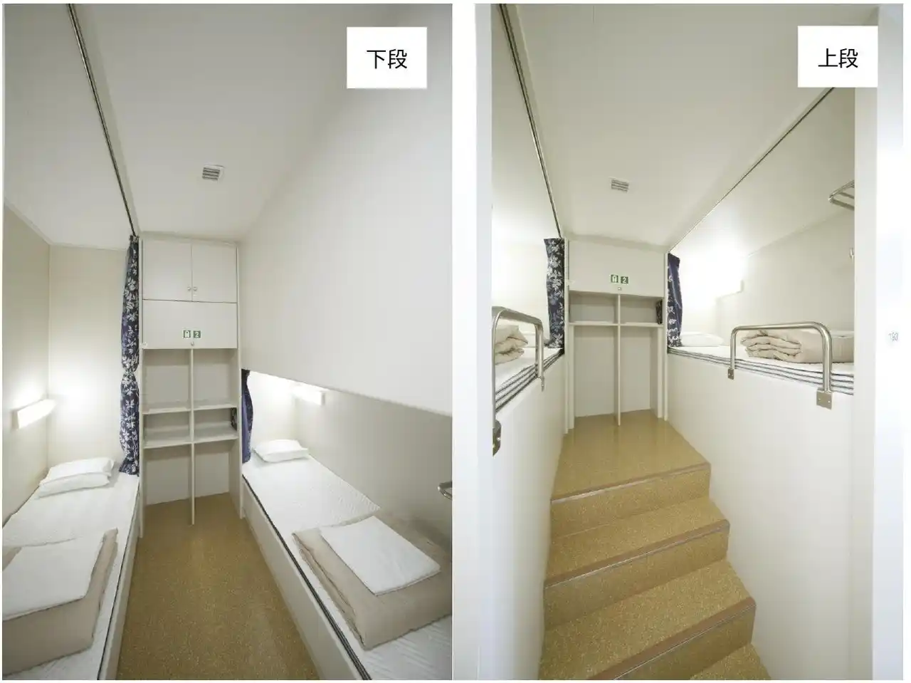 お一人様1ベッド。下段と上段が互い違いの入口になっているため、プライベート空間も確保 |