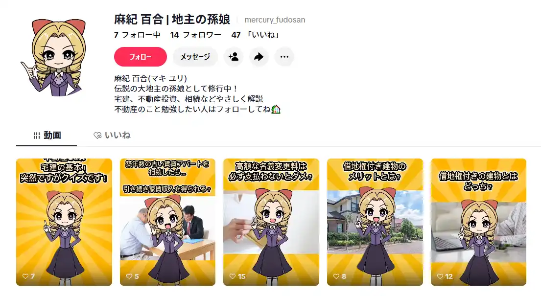 | 不動産買取事業を手がける弊社は、これまで借地権や共有持分など、権利関係が複雑な不動産を含め、多くのご相談に対応してまいりました。 一方で、「内容が難しく理解しづらい」という課題がありました。そこで今回、キャラクターとショート動画を掛け合わせた新しい切り口を取り入れることで、不動産の難しい情報をより分かりやすく伝えるとともに、麻紀百合ブランドの認知向上や、知識があり信頼できる会社であることをより多くの方に知っていただくことを目的とし、アカウントの開設に至りました。 | |||