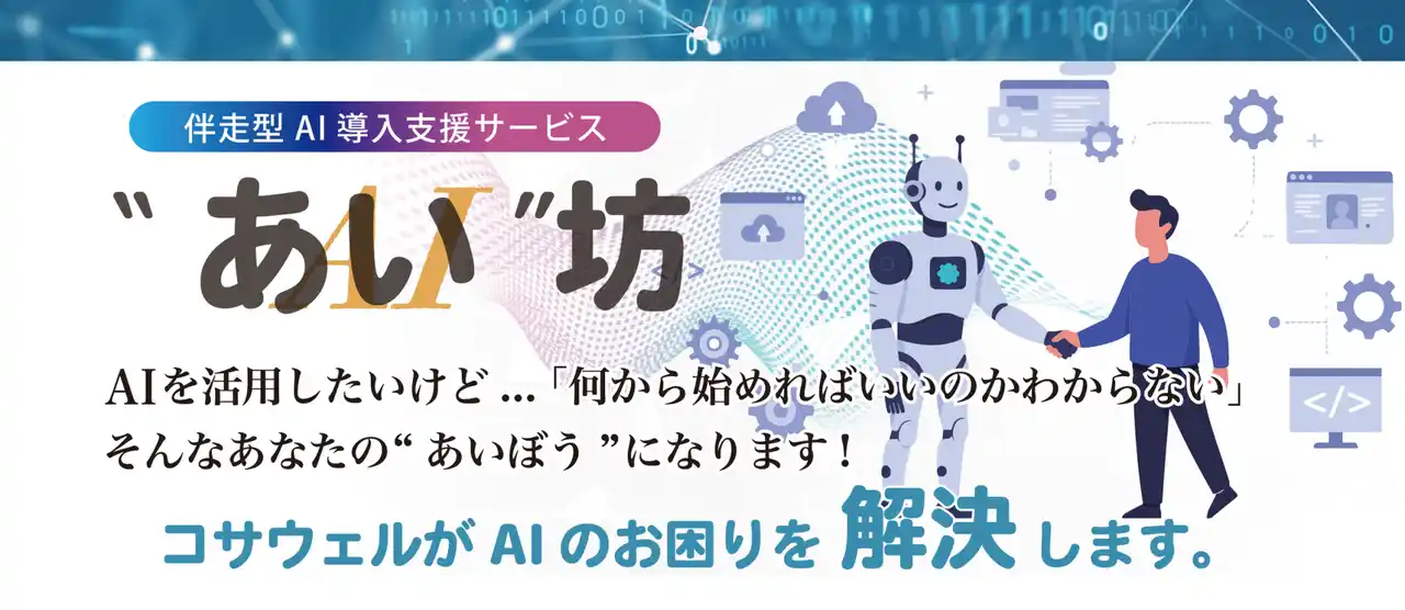 今回の提携について コサウェルは、AI・DX領域におけるシステム開発および導入支援を通じて、企業の業務効率化や生産性向上を支援してまいりました。近年では、AI活用に関する知識や人材不足といった中小企業特有の課題に対応するため、企画立案から導入、運用・定着までを一貫して支援する伴走型AI導入支援サービス「あい坊」を展開しています。 |
