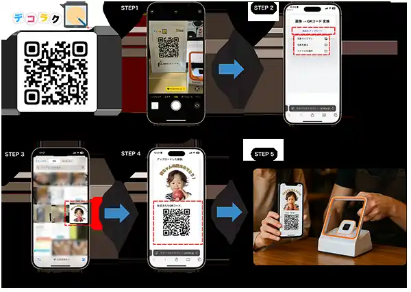 お客様とのデータのやりとりが簡単に: QRコードリーダーをWindows端末に接続するだけで、「デコラク」に画像データ転送が簡単にアップロードでき、来店時のタイムリーなデータの授受が可能に。メール入稿の手間や画像間違いを防ぎ、タイムリーなサービス提供を可能にします 。(QRコードリーダーは別売) |