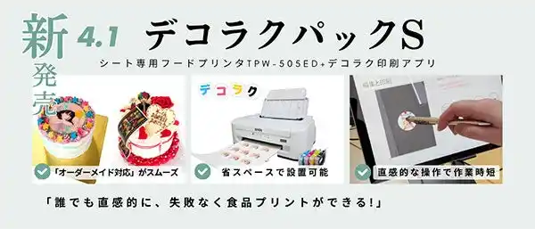 体験型エンターテインメントをプリントテクノロジーで創造する株式会社SO-KEN(本社:大阪府箕面市)は、令和8年4月1日より、最新の可食シート専用プリンター『TPW-505ED』と、誰でも直感的に操作できる専用アプリ「デコラク」をセットにした『デコラクパックS』の販売を開始いたします。 |