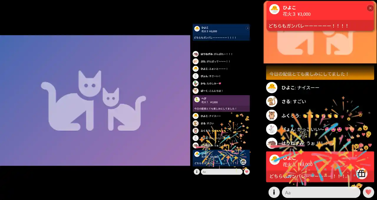 イベント中に参加者にデジタルコンテンツを販売できます。デジタルコンテンツの購入者はエフェクト付き応援メッセージを投稿できます。 |
