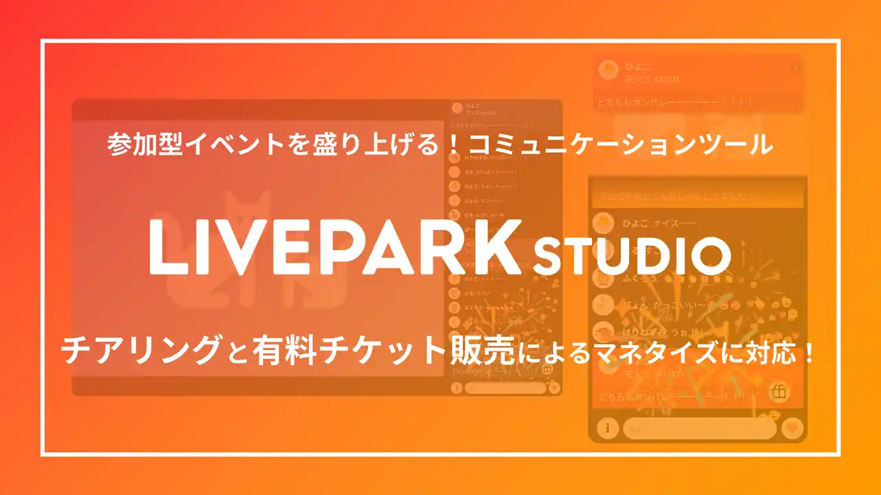 LIVEPARK STUDIO(ライブパークスタジオ)は、一体感のあるリアル・ハイブリッドイベントを実現するコミュニケーションツールです。 |