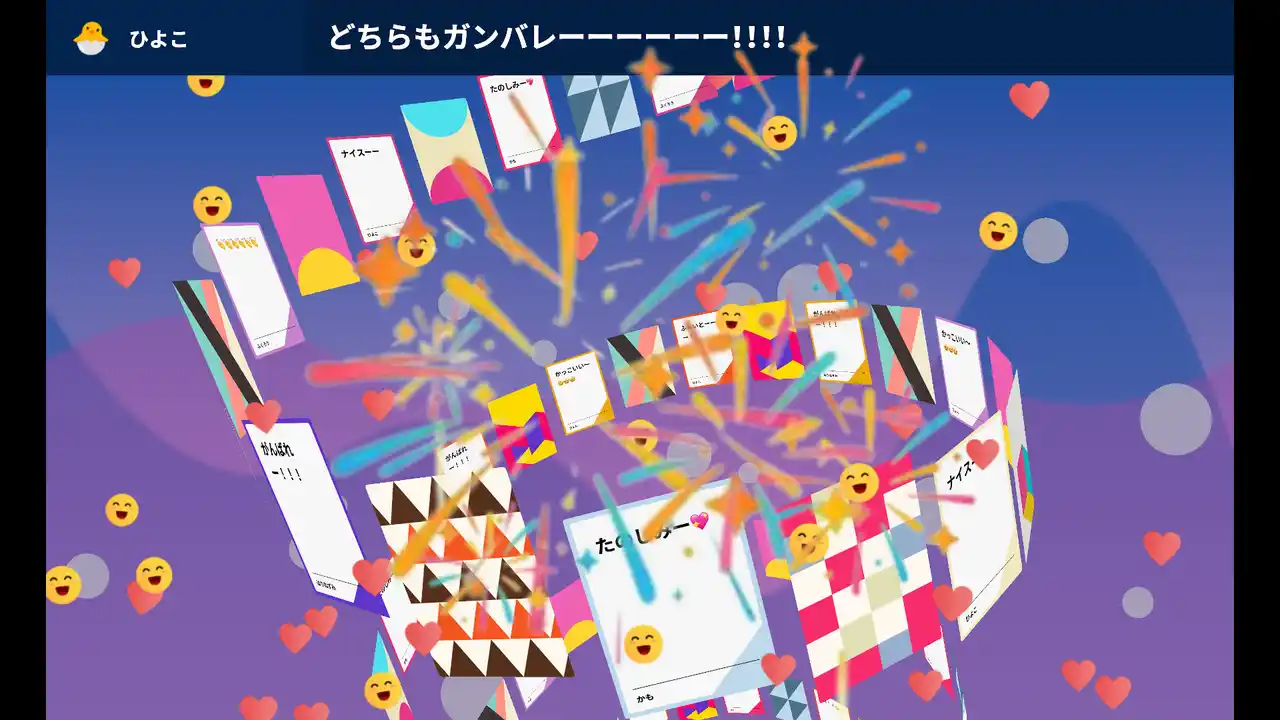 オプション機能のデータビジュアライザーで会場の大型ビジョン/スクリーンにエフェクト付き応援メッセージを表示できるので、ライブ配信だけでなく、ハイブリッドイベントやリアルイベントでも、イベント参加者全員が盛り上がりを共有できます。 |