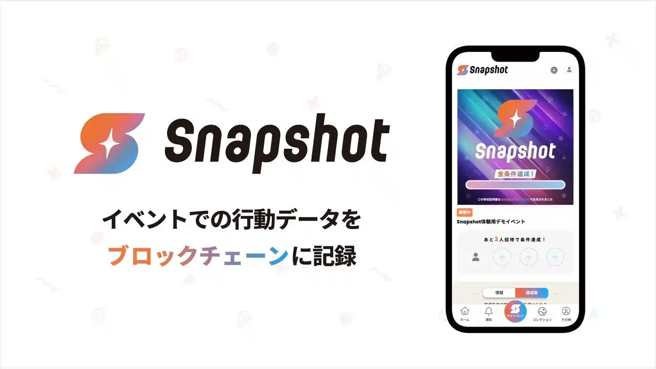 Snapshotとは、イベントにおける「参加記録」「ミッション設定」「特典受け取り」をワンストップで実現するイベント主催者向けサービスです。サービス内での行動履歴はブロックチェーンに記録され、改ざんが不可能な記録として、分析などに活用できます。 |