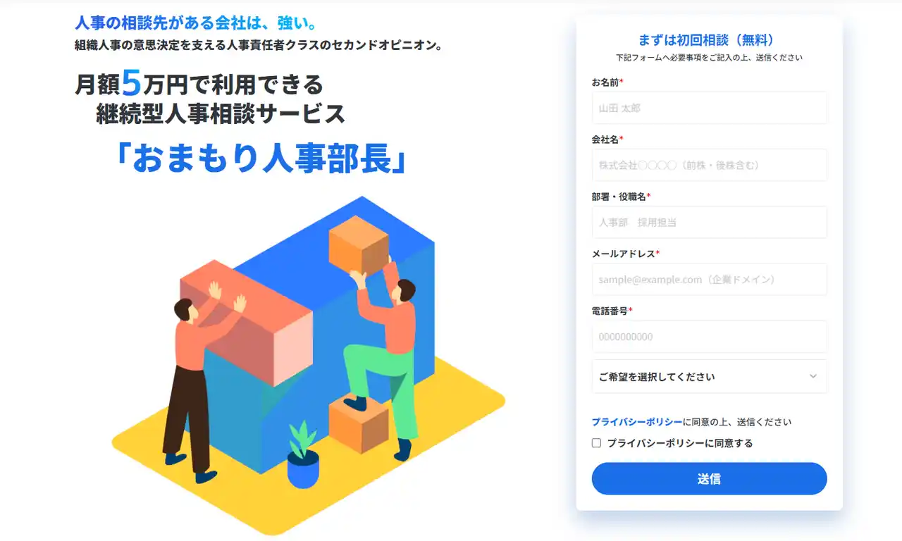 | 人事顧問やコンサルティングサービスでは月額数十万円以上の高額になることも少なくありません。「おまもり人事部長」は、月額5万円(税別)という現実的な価格で人事責任者クラスの知見にアクセスできるサービスです。スタートアップや中小企業にとって必要十分な人事支援を提供します。 | |||||||||||||||||||||||||||||||||||