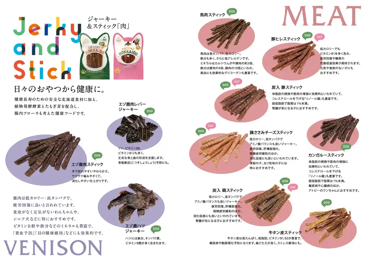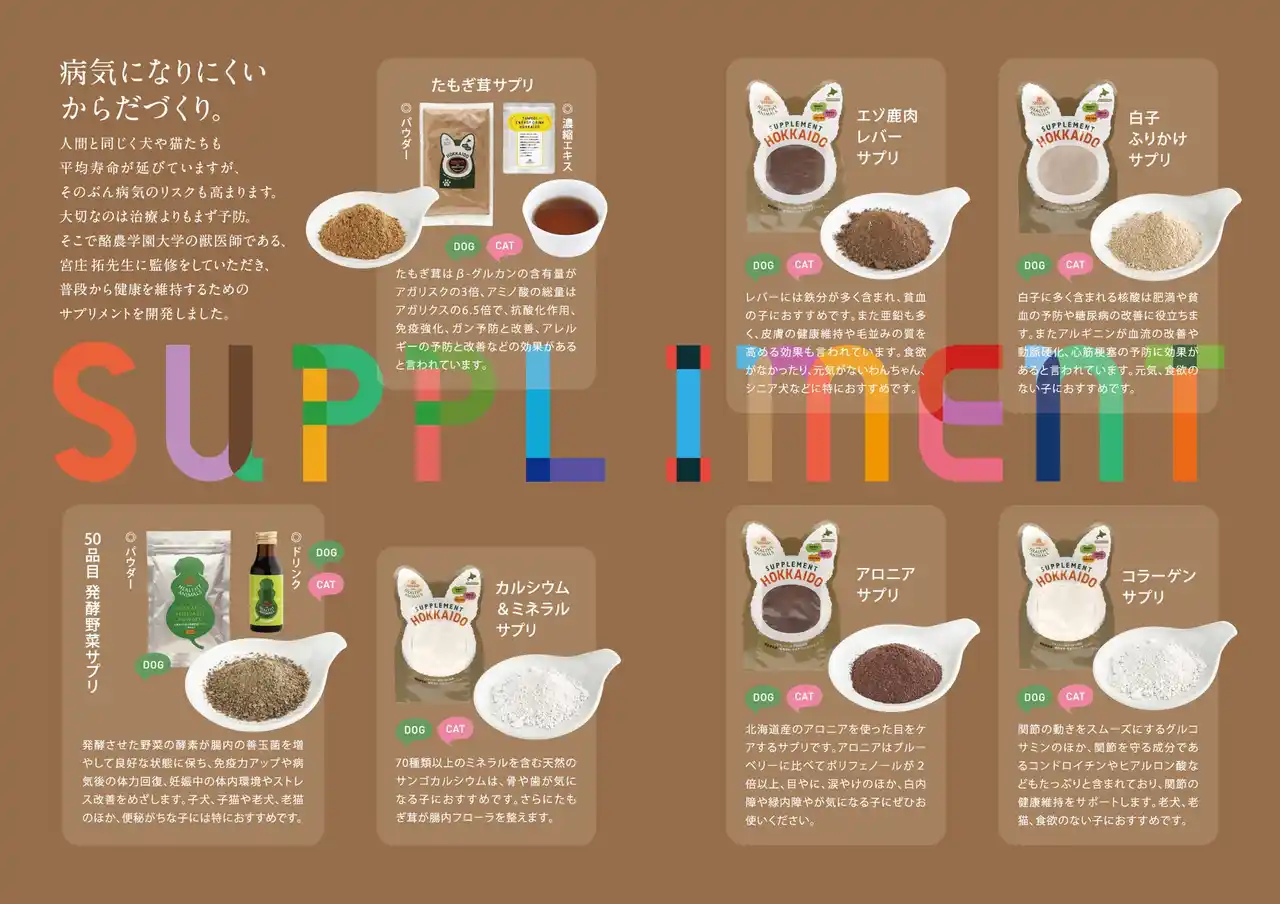 | 2013年のブランド立ち上げ以来、腸内環境に着目し、植物酵素やたもぎ茸を配合したペットフードやサプリメント、ケア用品の企画・製造・販売(卸売を含む)を展開しています。 | |||||||||||||