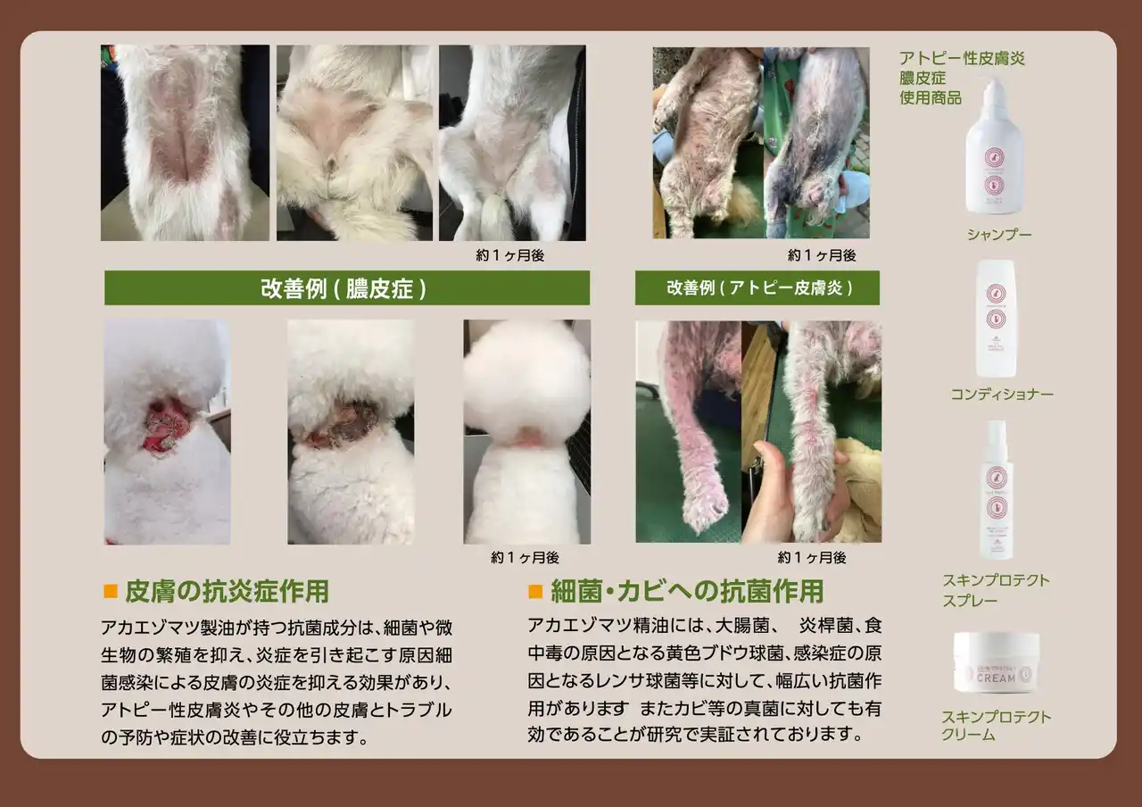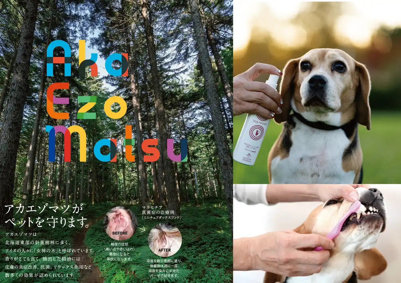| 本シリーズは、特許成分「アカエゾマツ」を配合したペットケア製品です。主成分であるアカエゾマツには、抗菌・除菌・消臭に加え、抗ピロリ菌作用(特許取得)や抗炎症作用(特許取得)などの機能が報告されており、論文や学会においてその有用性が示されています。 | |||||||||||||