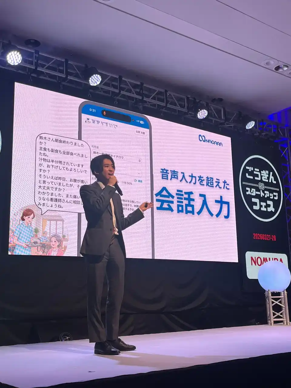 介護業界向けAI SaaSを開発する株式会社NAGARA(本社:愛知県名古屋市、代表取締役CEO:岡田一輝、以下「NAGARA」)は、2026年3月27日(金)に島根県松江市で開催された「ごうぎんスタートアップフェス2026」(主催:山陰合同銀行)において、最優秀賞を受賞したことをお知らせいたします。全国から選出されたファイナリスト5社によるピッチ審査の結果、介護現場の記録業務をAIで変革する「ながらかいご」の事業構想が最も高い評価を受けました。 |