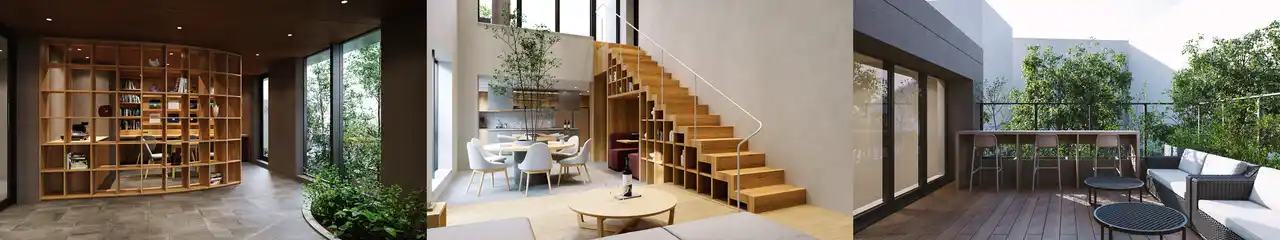 左から、エントランス、リビング・ダイニング、ルーフトップ |