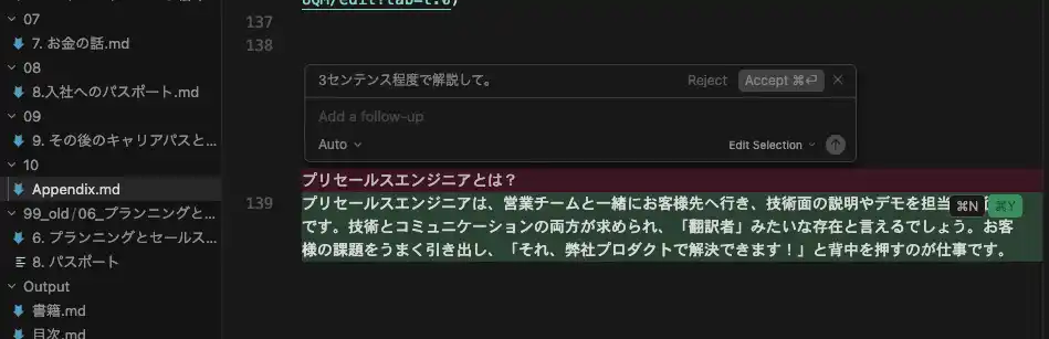 CursorとClaudeを組み合わせた執筆環境。選択したテキストに対してAIが文章を生成・補完する |