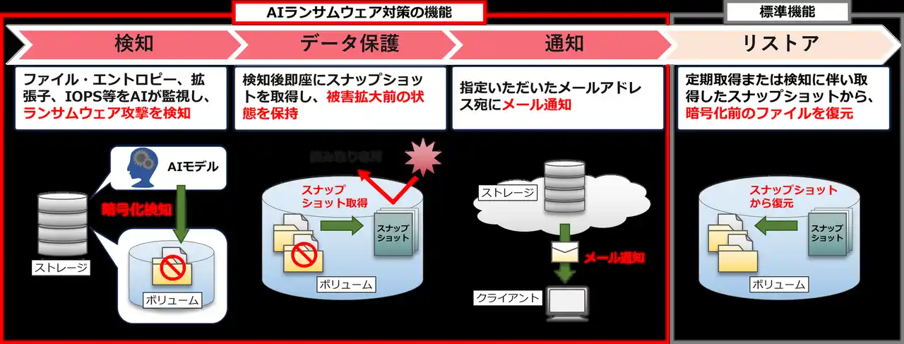 | 深刻化するランサムウェア被害や未知のサイバー攻撃に対し、従来の対策では防御が困難になっているため、企業は確実なデータ保護と迅速な復旧体制の構築が急務となっています。「AIランサムウェア対策」メニューは、ストレージに搭載されたAIモデルがランサムウェアの攻撃をリアルタイムに検知し、データを保護するソリューションです。従来のエンドポイントやネットワーク層での対策に加え、ストレージ層での自律的な保護を追加することで、お客さまのシステムをより強固に保護することが可能となります。 | |||