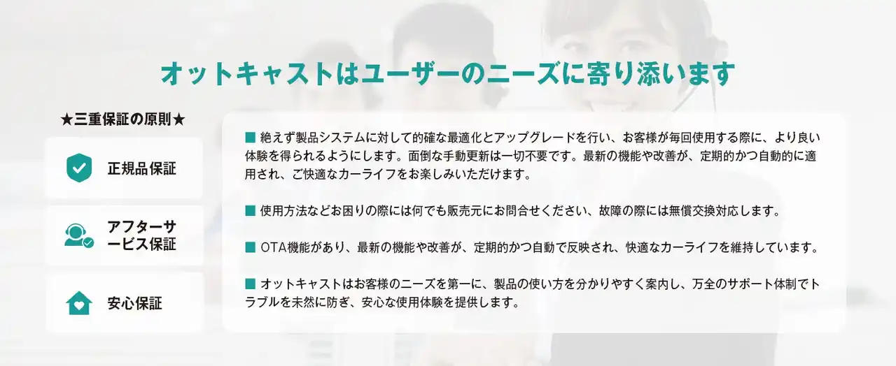 | オットキャストはお客様のニーズを第一に、製品の使い方を分かりやすく案内、万全のサポート体制でトラブルを未然に防ぎ、安心な使用体験を提供します。 | |||||||||||||||||