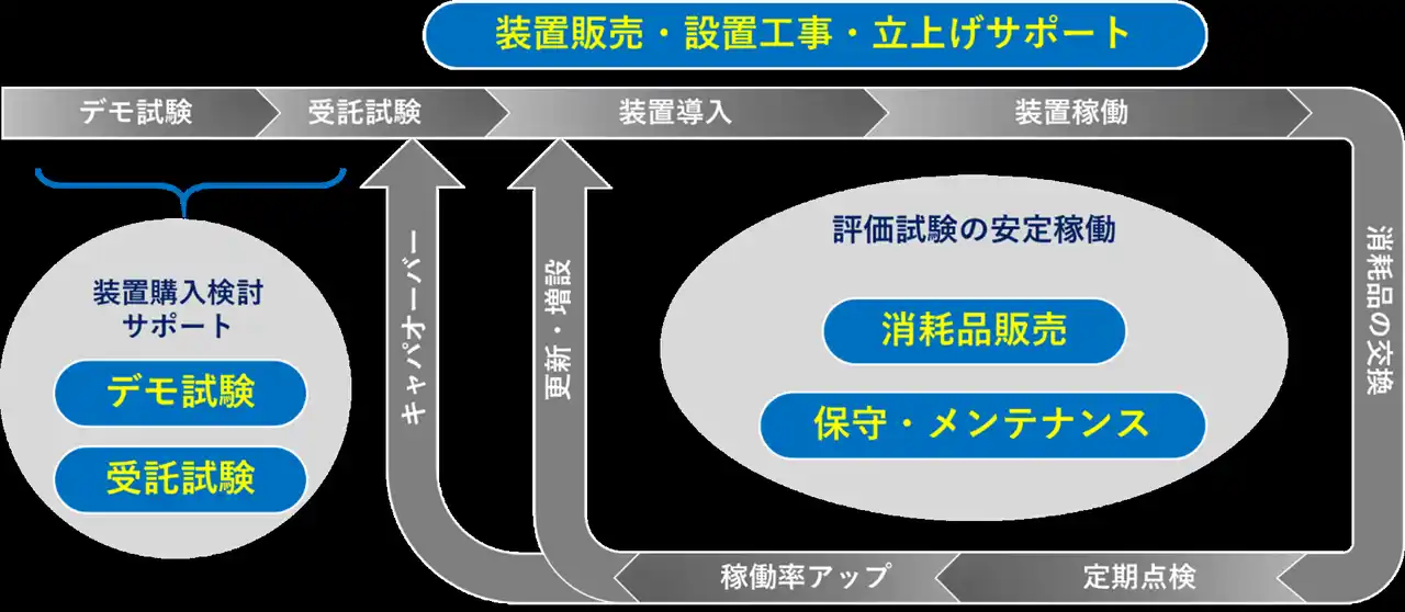 試験装置の購入前に、デモ試験や受託試験のサービスを行っております。本導入後も、設置工事や立ち上げサポート、保守・メンテナンスなどのアフターサービスにより皆様の研究開発体制を支援します。 |