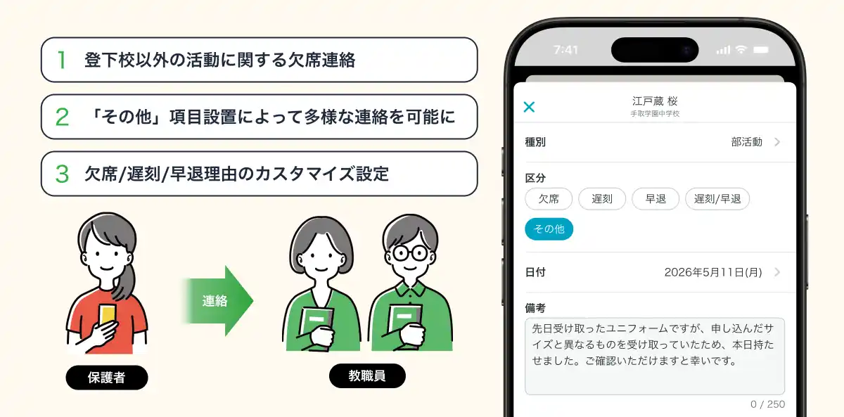 | その中で、学校では毎日の登校に関する欠席連絡に加え、部活動やプール見学、スクールバスの利用有無など、学校生活のさまざまな場面で保護者からの連絡を受け取る必要に対する要望があり、欠席理由の管理方法や必要な連絡項目が学校ごとに異なる状況、学校の実態に合わせたより柔軟な運用を実現するため、tetoruでは既存の欠席連絡機能をさらに拡張し、学校ごとに連絡項目や欠席理由を設定できる新機能「欠席連絡カスタマイズ」を開発いたしました。 | |||