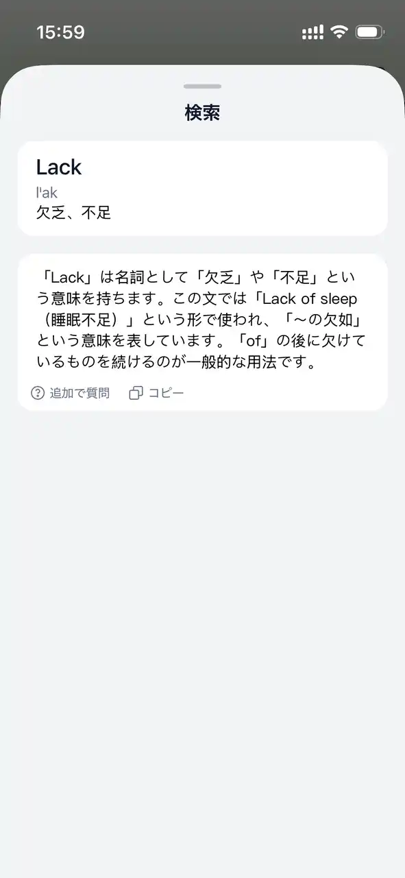また、現在の文をもとに、文法構造や使用シーン、表現の違いなどについてAIに質問することも可能で、より深い理解を促進します。 |