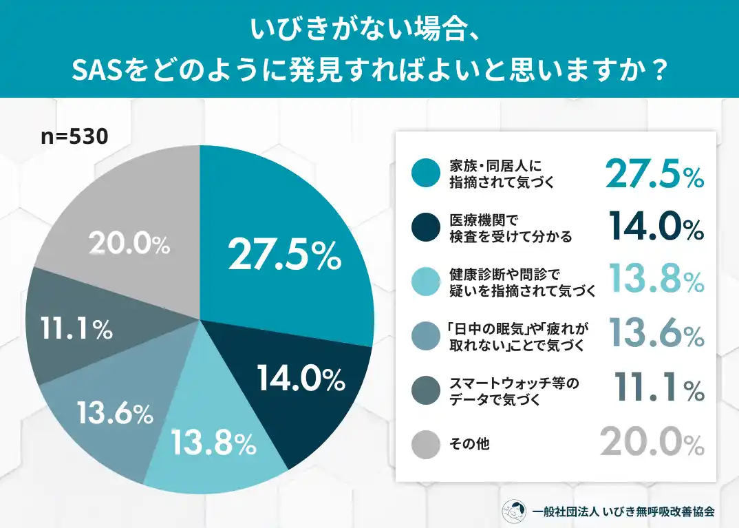 いびきがない場合の発見方法として、約4人に1人(27.5%)が「家族・同居人の指摘」を挙げる |