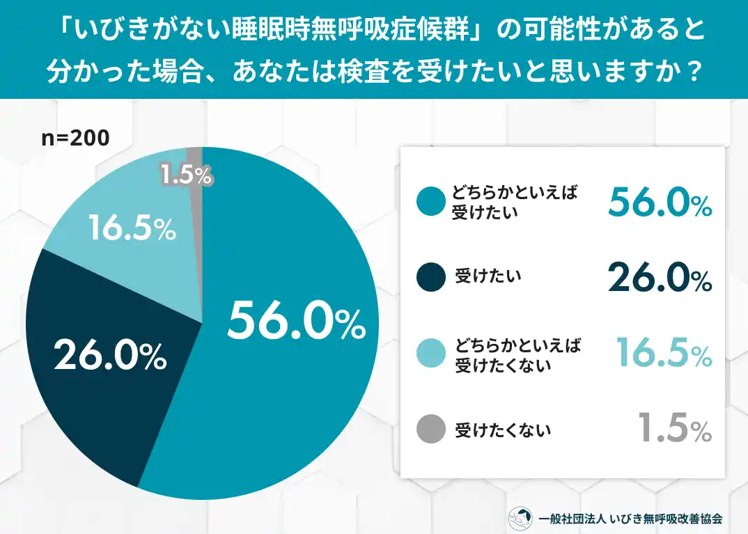 「いびきがないSAS」の可能性を知った場合、82.0%が「検査を受けたい(どちらかといえば含む)」と回答