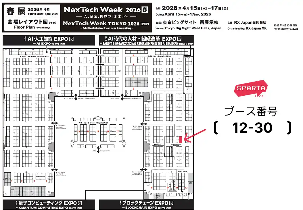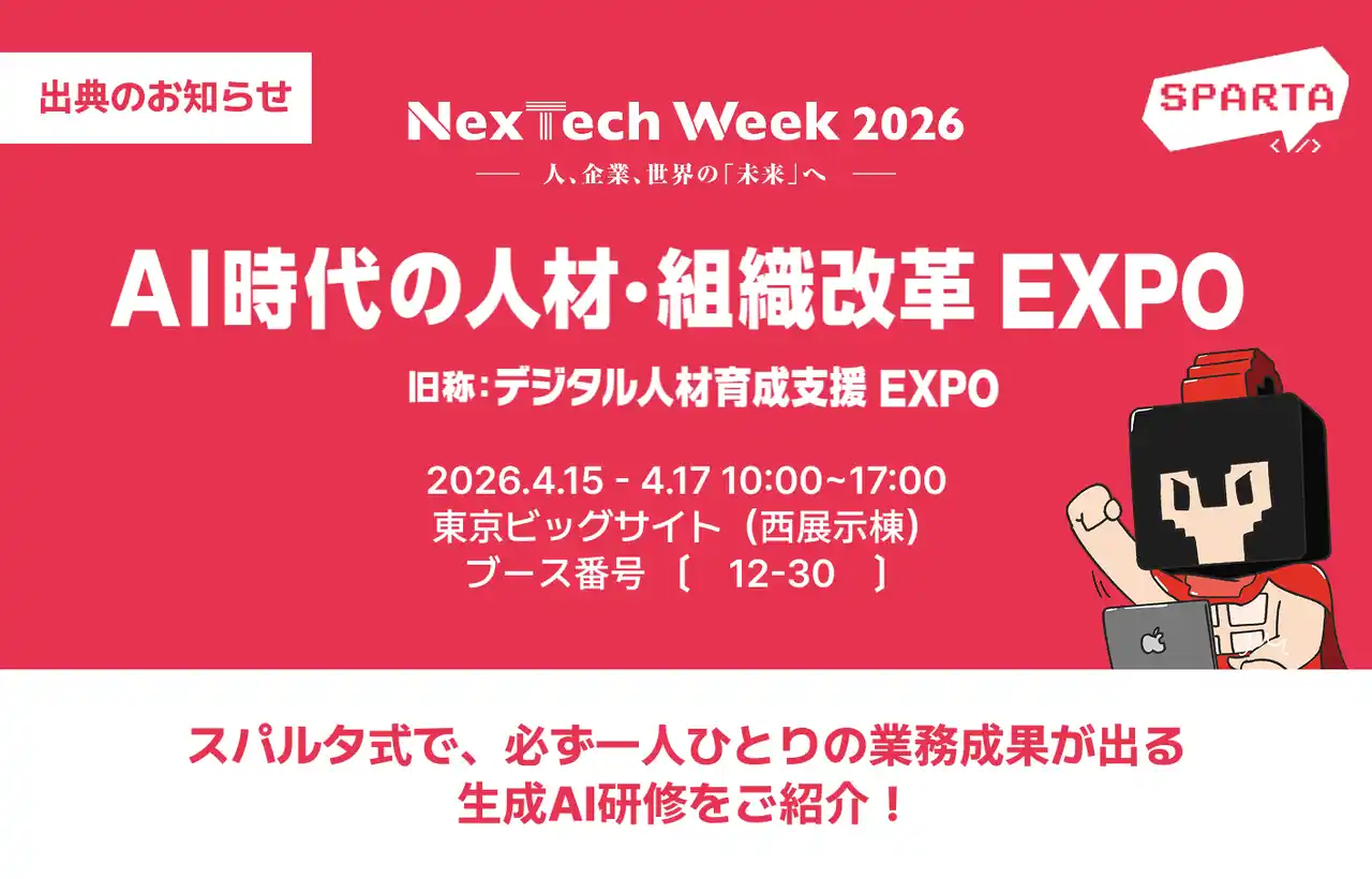 株式会社TeamSpartaDX・AI人材育成サービス提供する株式会社TeamSparta(所在地:東京都千代田区、代表取締役:イ・ボムギュ、以下「TeamSparta」)は、2026年4月15日(水)~17日(金)に東京ビッグサイトで開催されるNexTech Week 2026【春】「AI時代の人材・組織改革EXPO」に出展いたします。 |