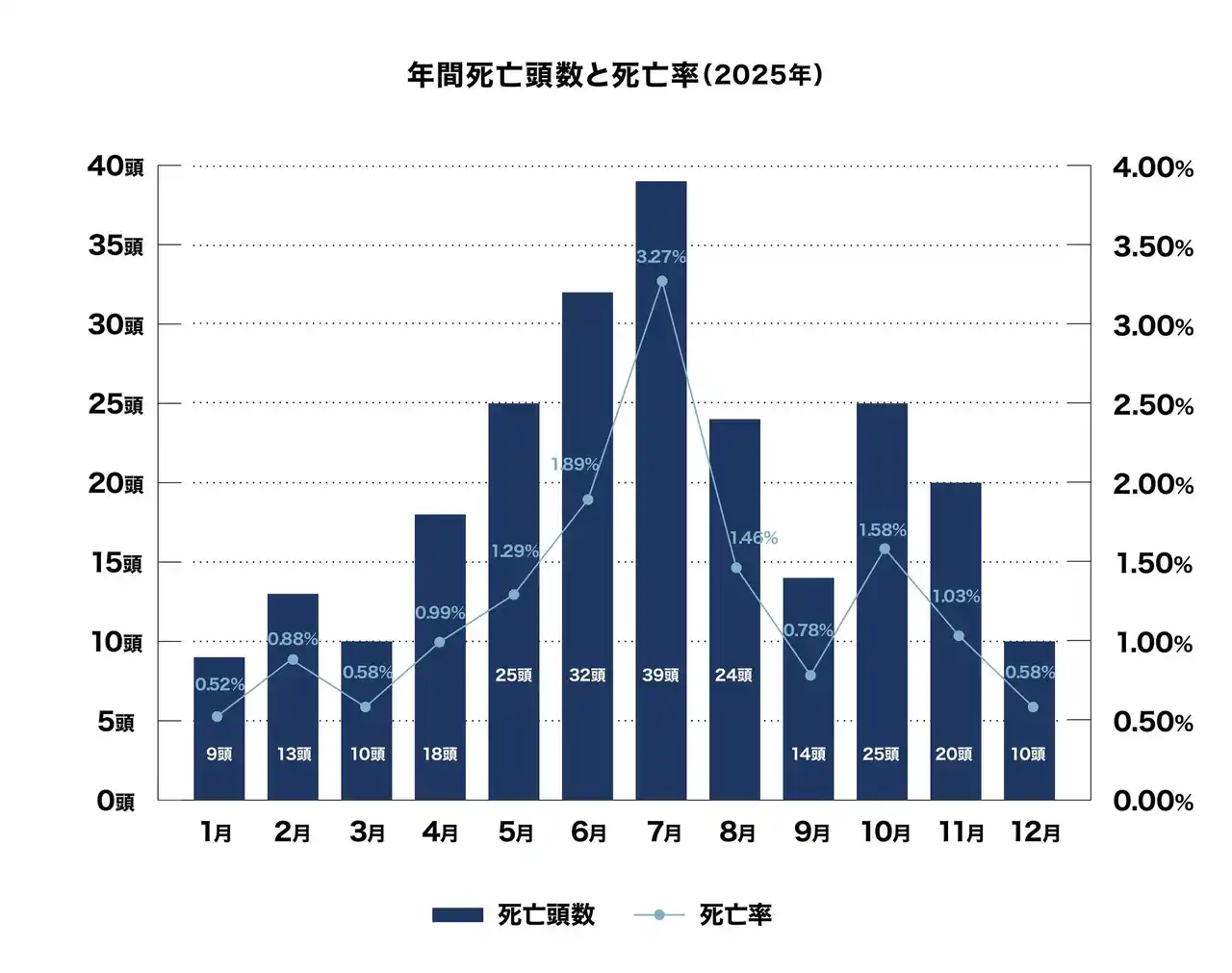 2025年の月別の死亡率推移は以下のようになっており、6~7月において死亡頭数および死亡率の増加が認められましたが、その後、下降傾向を辿っています。 |