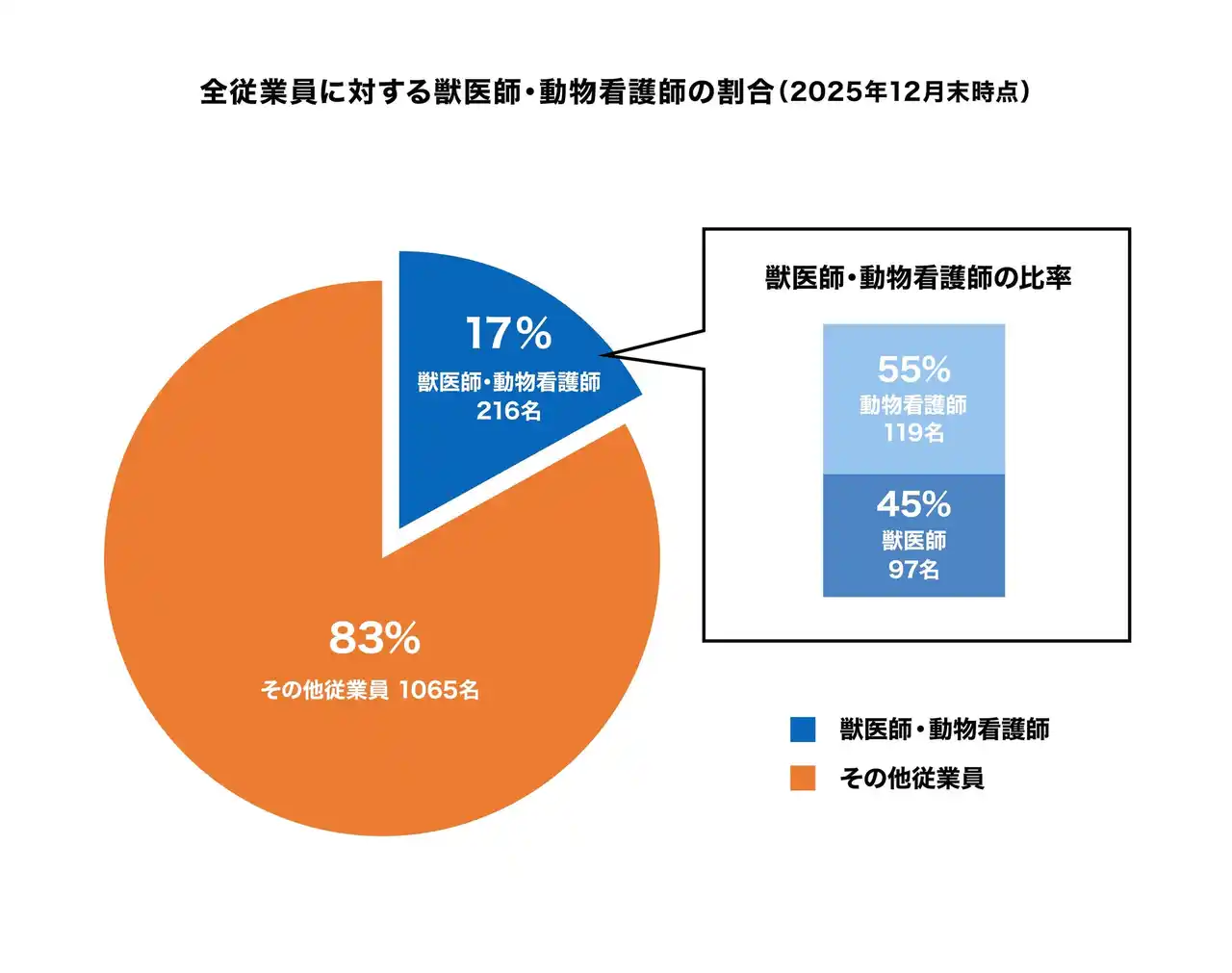 死亡事故ゼロの実現と、さらなるペットのウェルネス向上を目指し、人員体制の拡充を進めた結果、2025年12月末時点における獣医師・動物看護師の割合は17%(計216名 ※業務委託含む)となっています。 |