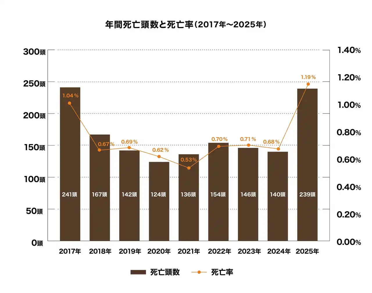年間死亡事故数は239頭(昨年比+99頭)*1、死亡率として1.19%(昨年比+0.51%)*1でした。 |