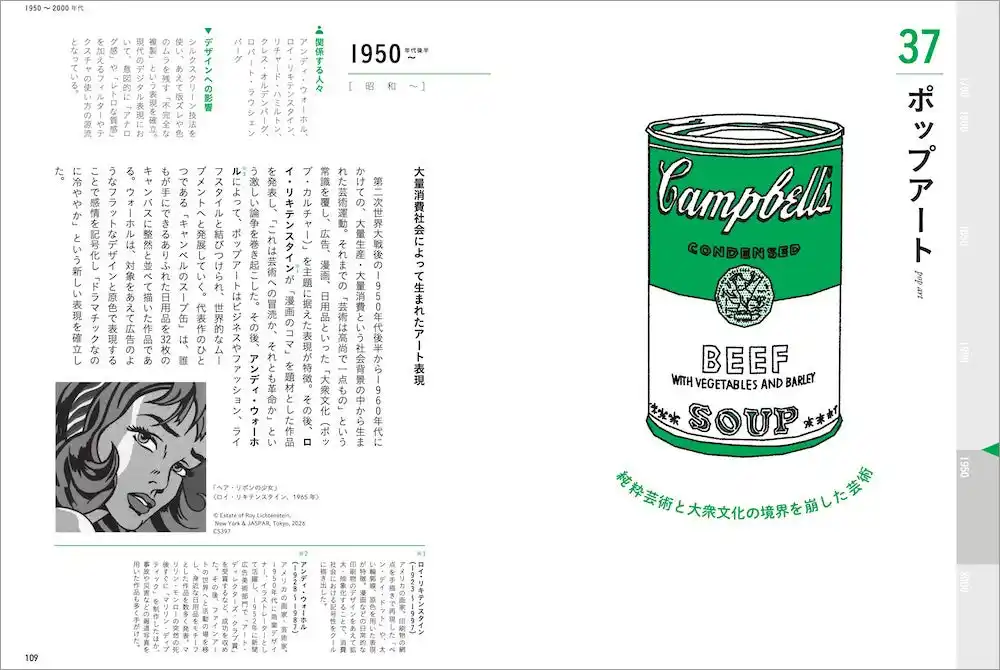 また、21世紀以降に登場したデザイン用語についても多数収録。文字面だけでは理解しづらいIT分野や抽象的な概念についても、シンボライズしたイラストが理解の助けになります。古代から今この瞬間までのデザイン史を、広く概覧できるようになっています。 |