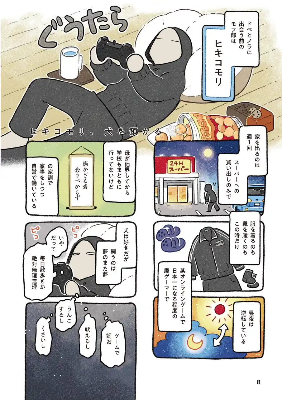 ヒキコモリ生活を送るモフ郎。昔から犬を飼いたいという思いはあったが、自称“動物嫌い”の父に反対され、何よりヒキコモリの自分には無理だと諦めていた。 |