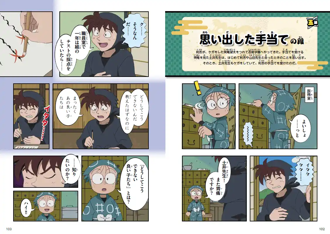 五話 思い出した手当ての段 利吉(りきち)が、ケガをした突庵望太(とつあんぼうた)をつれて忍術学園へやってきた。手当てを受ける突庵を見た土井先生は、はじめて利吉や山田先生と会ったときのことを思い出す。 |