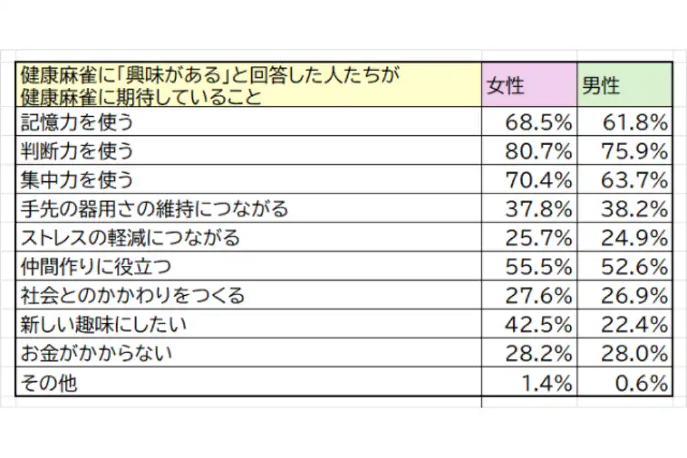 健康麻雀に「とても興味がある」「ややある」と回答した730人。期待する点(複数回答)では、「判断力を使う」(571人)、「集中力を使う」(489人)、「記憶力を使う」(476人)などが上位に並びました。また「仲間づくりに役立つ」(394人)も多く、近所の人との新しいつながりが生まれるといった交流の場としての側面も浮かび上がりました。 |