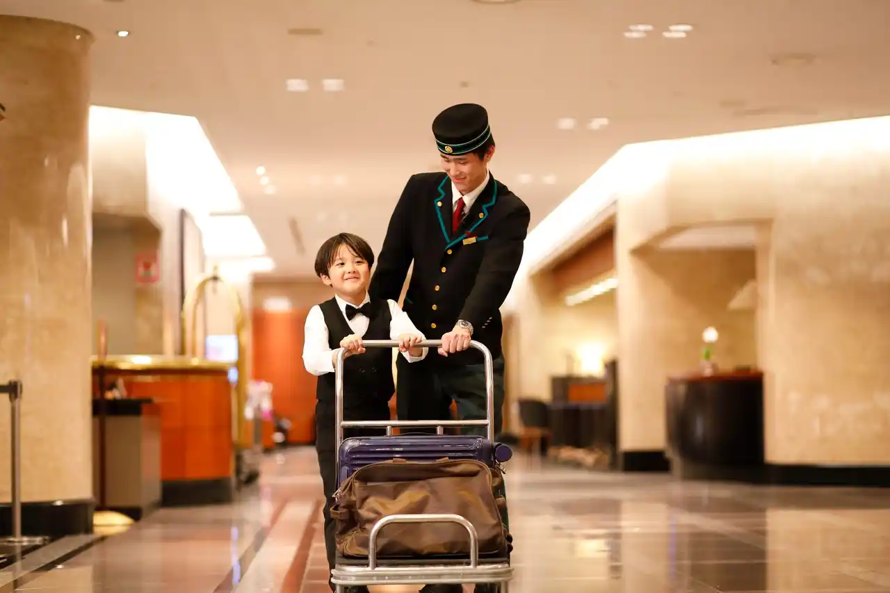チェックイン当日、ホテルに到着したお子さまは専用の制服に着替えていただき、ホテルスタッフから「ご挨拶」や「お辞儀の仕方」「ベルワゴンの動かし方」などを学んでいただきます。レクチャーを終えたらいよいよ本番!フロントで待つご家族のもとへ向かい、実際にお部屋までご案内していただきます。重い荷物を運びながら「こちらへどうぞ!」と誇らしげに歩くお子さまの姿は、最高のシャッターチャンス。ご家族にとって忘れられない感動の瞬間となるはずです。 |