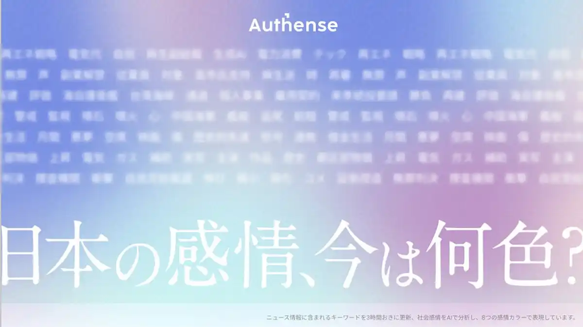 | Authense法律事務所は、感情に敏感でありたいという思いから、”今”世の中が興味を抱いているニュース、社会感情についてAIで分析し、3時間おきにWEBサイトを更新しています。あなたの感情は、今は何色ですか? | |||
