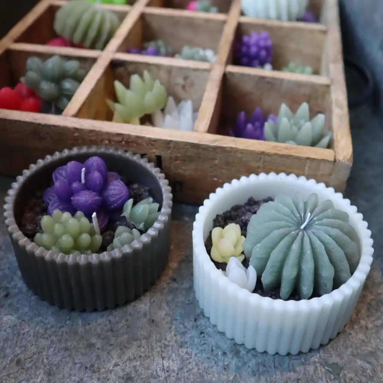 キャンドルの素材でできたカラフルな器と多肉植物のパーツを選んで、オリジナルのキャンドルを作るワークショップです。 |