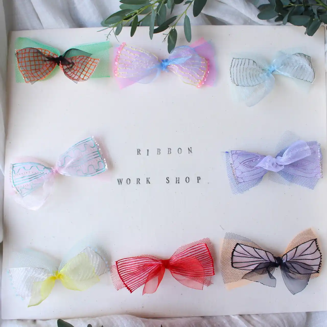 オリジナルで刺繍したオーガンジーとチュールを組み合わせて作るリボンのワークショップです。最後にヘアピンかゴムを選んで仕上げます。 |
