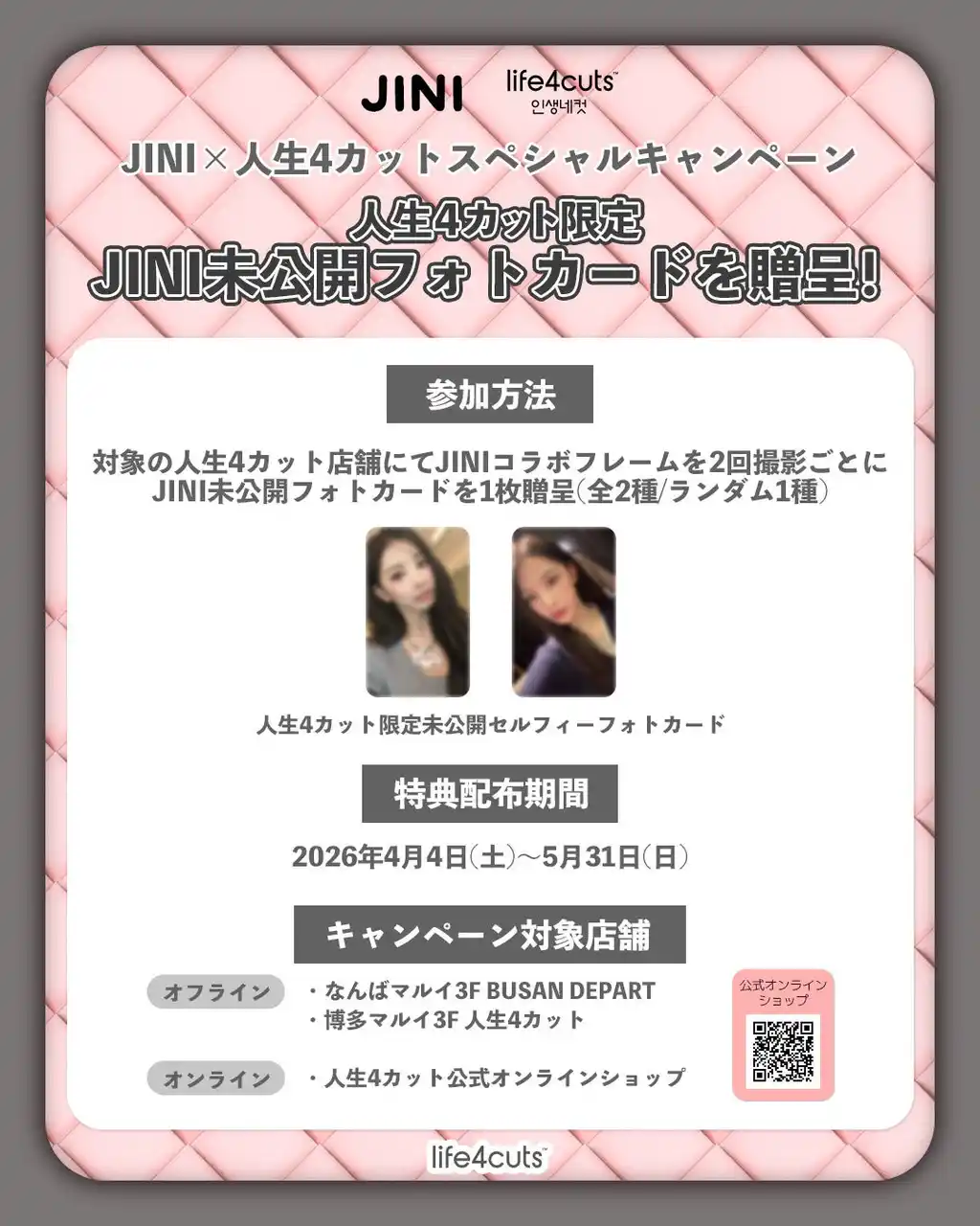 PROJECT(本社:福岡県北九州市)が運営する韓国発のセルフフォトブランド「人生4カット」は、ソロアーティストJINIとのコラボレーションフレームを発表いたしました。 本企画は、2026年4月5日(日)に京セラドーム大阪にて開催される「関西コレクション」へのJINI出演を記念して実施される特別コラボレーションです 本コラボレーションでは、JINIの魅力やアーティスティックな世界観を反映した限定デザインの撮影フレームを展開。 まるで本人と一緒に撮影しているかのような特別な体験をお楽しみいただける、ファン必見のコンテンツとなっています。 対象店舗、オンラインショップにて本コラボフレームを2回撮影(購入)いただいた方には、JINIのフォトカードを1枚プレゼントいたします。 さらに、コラボを記念したSNSキャンペーンも実施し、JINI直筆サイン入りチェキおよび直筆サイン入り人生4カットフレームを抽選でプレゼントいたします。 この機会に、JINIとの特別な思い出を「人生4カット」でぜひお楽しみください。 |