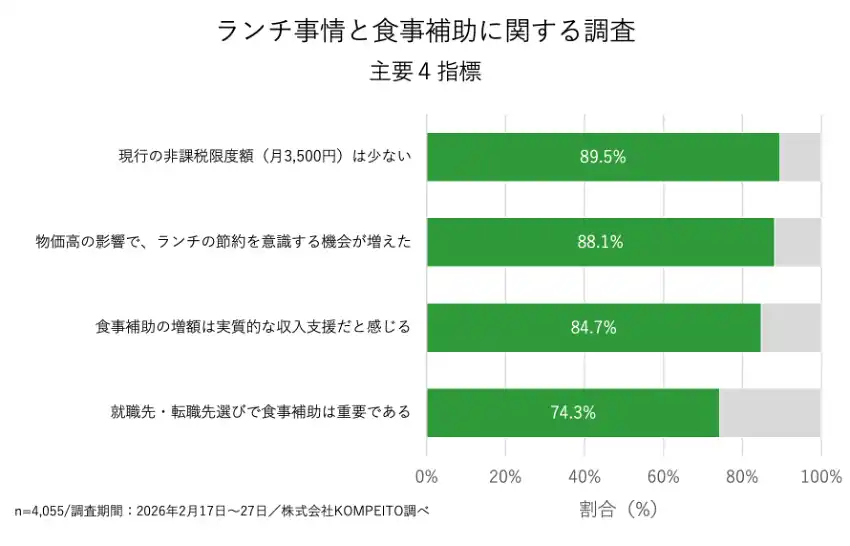 | 設置型健康社食(R)「オフィスでやさい」を運営する株式会社KOMPEITO(本社:東京都品川区、代表取締役CEO:渡邉 瞬)は、2026年4月に予定されている食事補助の非課税限度額の引き上げ(※1)(3,500円→7,500円)を前に、全国の働く人(YASAI PAY登録者)を対象に「ランチ事情と食事補助」に関する調査を実施しました。 | |||