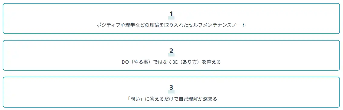タスクやスケジュールを書くページはありません。「TO BEリスト」を通じて、ありたい自分・なりたい自分を描き、外的義務ではなく内発的動機から行動できる習慣を育てます。 |