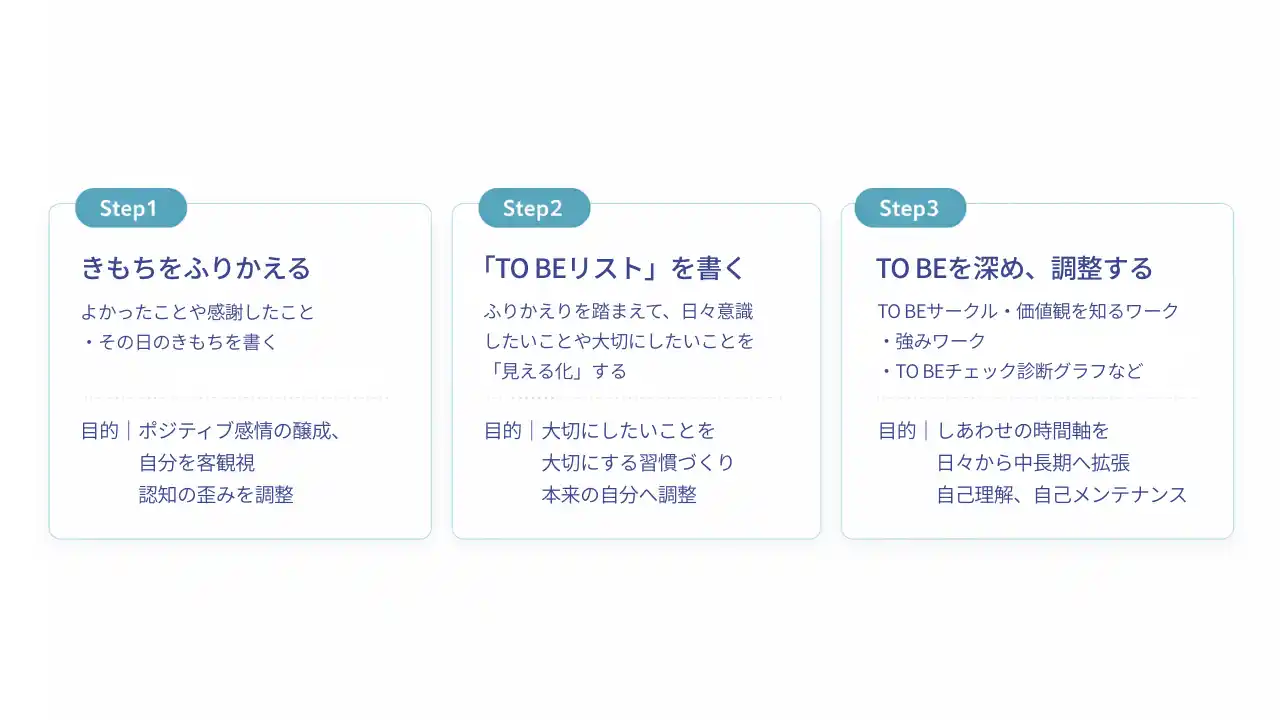 TO BEサークル、価値観・強みワーク、TO BEチェック診断グラフで、しあわせの時間軸を日々から中長期へと拡張します。 |