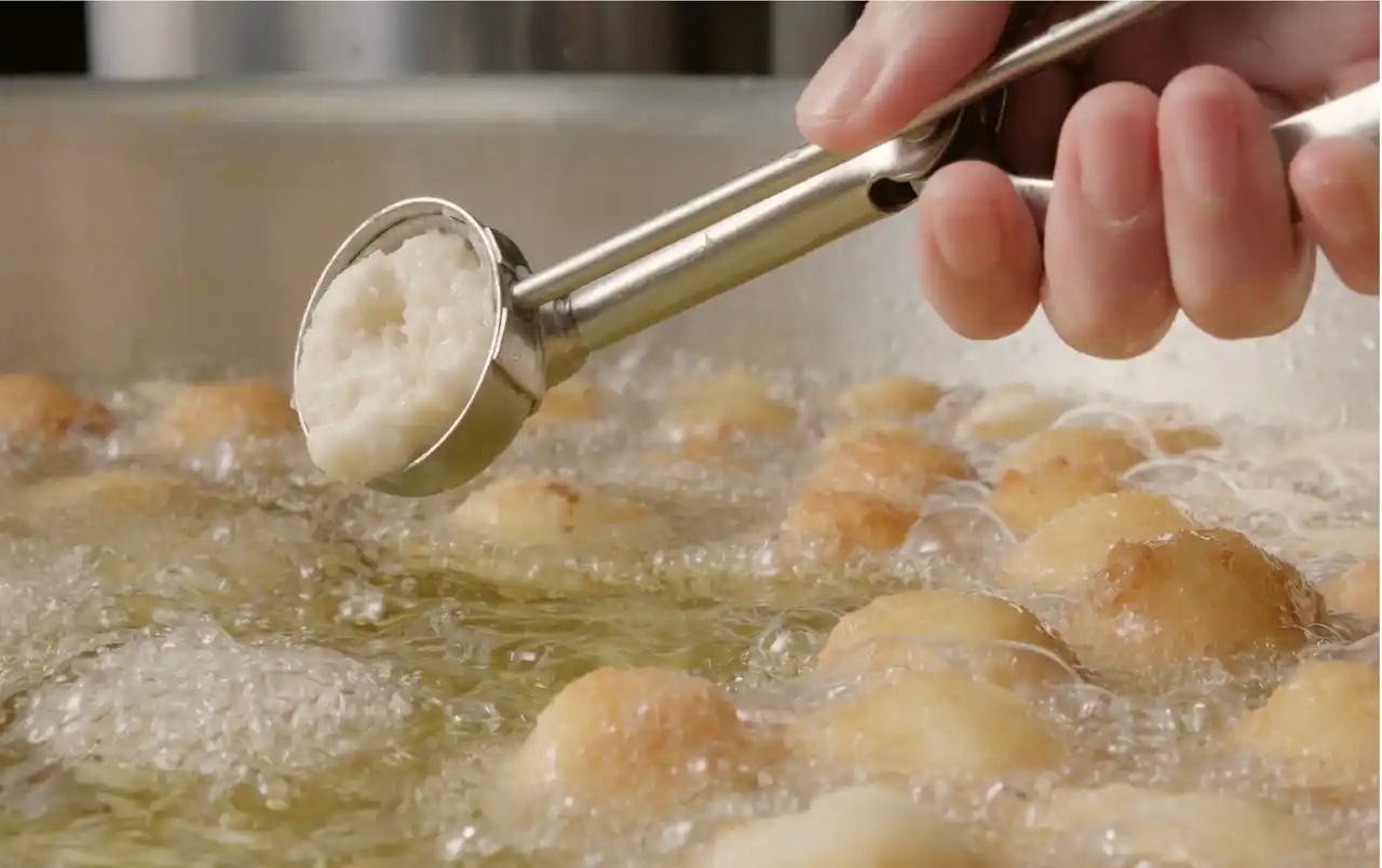 お店でうどんをミキサーにかけてペースト状に。数時間おきにひく白だしを生地に加えるのが丸亀製麺ならではのこだわり。旨みと香り高い風味をプラスします。もっちもち食感を生みだすために空気を含ませながらやさしく粉と混ぜ合わせ、生地を少し寝かせます。丸い形に整えて、ひとつずつ丁寧に揚げたらできあがり。手づくりならではの素朴なおいしさをお楽しみください。 |