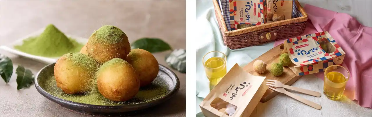 今回登場する『丸亀うどーなつ 抹茶味』には、京都・宇治で170年続く老舗「堀田勝太郎商店」の抹茶を贅沢に使用。「堀田勝太郎商店」の抹茶は、抹茶本来の甘みを最大限に引き出す後火二度焙煎が施されており、甘みが強く、まろやかな風味が特長です。抹茶のまろやかな風味と上品な香りが際立つ特製パウダーは、やさしい甘みのきび糖との比率にこだわり、程よい甘さでお子さまから大人まで楽しめる味わいに仕上げました。また「丸亀うどーなつ」最大の特徴である“もっちもち食感”との相性を追求し、粒子の細かい抹茶を使用することでしっかりとうどーなつに絡み、なめらかな舌触りと濃厚な味わいを楽しめます。 |