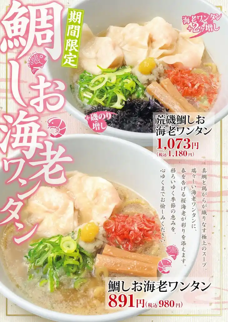 株式会社キタカタ(本社:新潟県新潟市)が運営する、「新潟らーめん 無尽蔵」では、2026年4月1日(水)より、春限定の季節メニューとして『鯛しお海老ワンタン』を発売します。新生活が始まる4月にふさわしく、“めでたい”食材である鯛を使用した、国産鯛×海老ワンタンの贅沢ならーめんです。 |