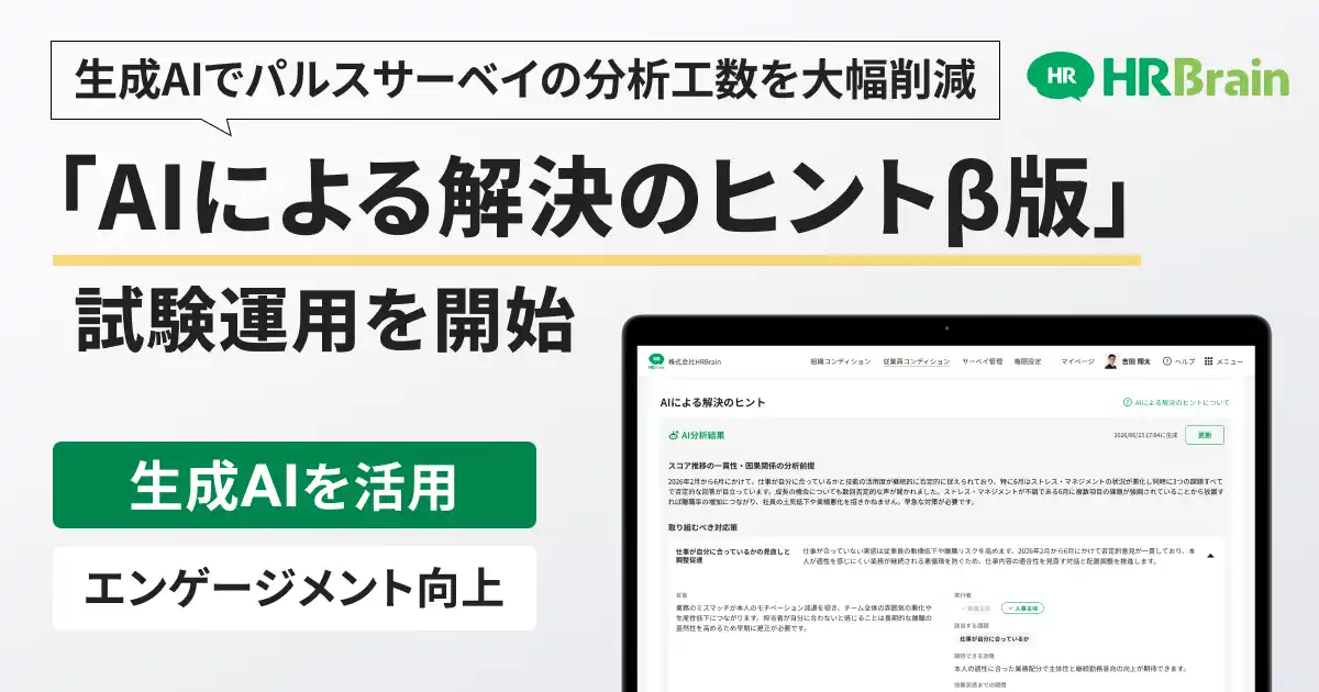 【株式会社HRBrain】 HRBrain、新機能「AIによる解決のヒントβ版」の先行利用を開始。生成AIで分析工数を大幅削減し組織改善を支援