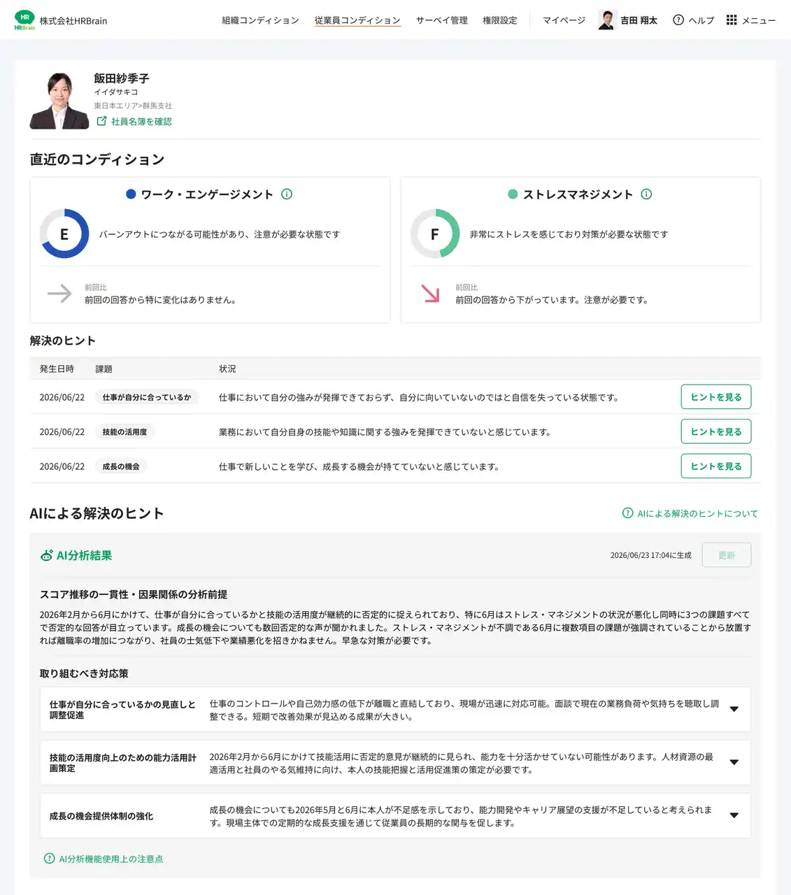 | 過去の回答データを参照し、現在の従業員の状態をAIが要約して傾向を提示します。 | |||