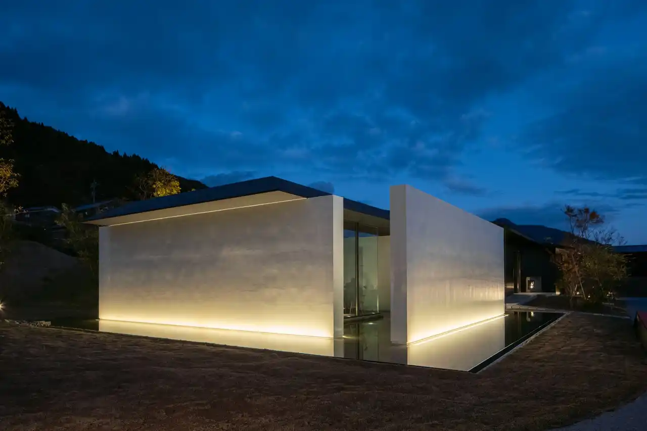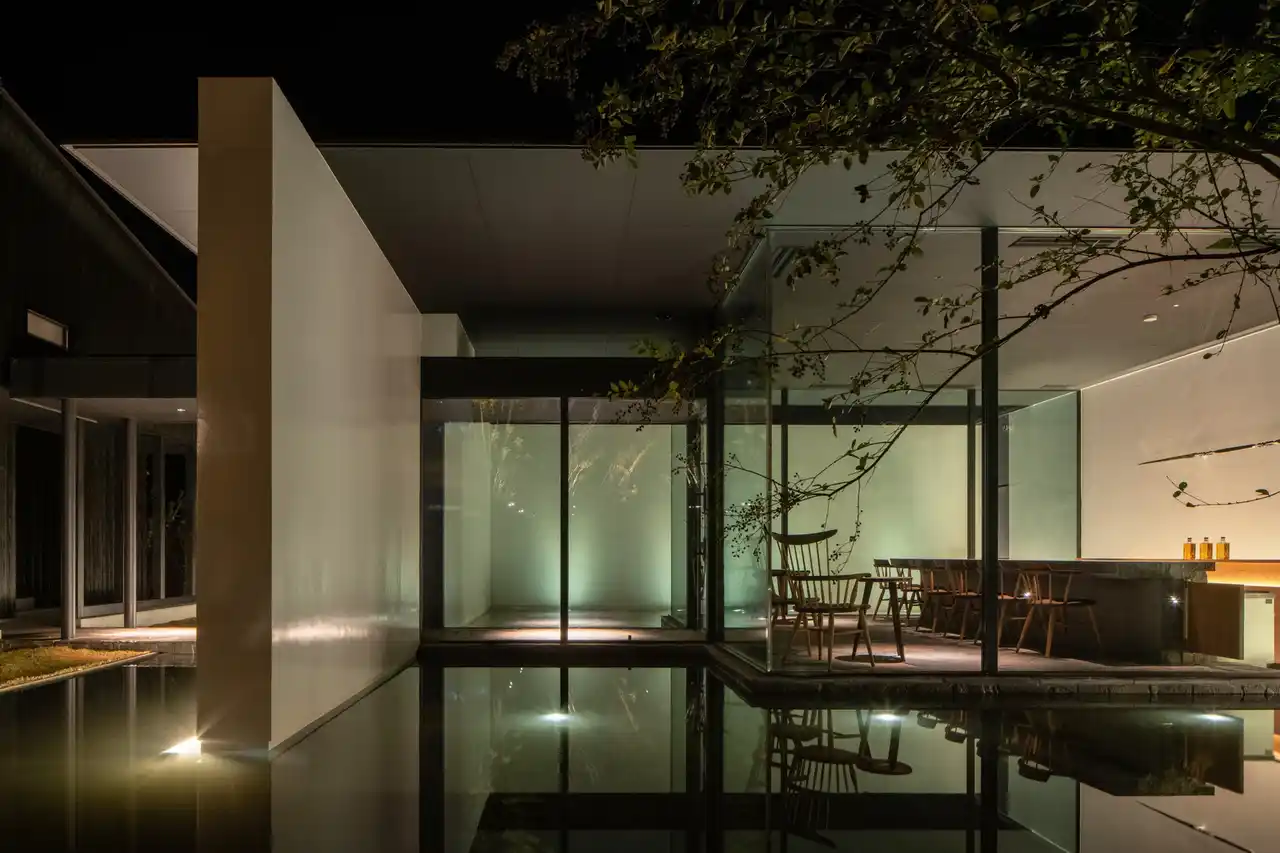 白い壁が水盤をやわらかく仕切り、その内側にはガラスに囲まれた小さな室内空間が広がります。内と外の双方に関わる白い壁が境界を曖昧にし、わずか8坪ほどの空間でありながら、建築・インテリア・景観を一体のものとして感じられるスペースを生み出しました。日本の原風景ともいえる里山の風景を背景に、「ひとつの場所」として感じられる空間にデザインされました。