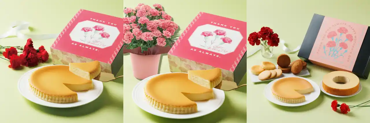 2026年の「母の日」は5月10日(日)です。チーズガーデンでは、『母の日限定御用邸チーズケーキ』※1や、大人かわいい印象のカーネーション鉢とのセット、公式オンラインショップ・楽天市場・LINEギフト限定の「母の日限定掛け紙」を掛けたチーズケーキやギフトセットをご用意いたしました。 |