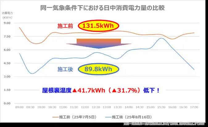本事業の結果から、屋根表面温度では最大34.3℃、屋根裏空間温度では最大9.7℃の低減が確認されました。更に空調の消費電力においても、同一気象条件下(全天日射量±0.3MJ/日、最高気温差±1.0℃未満)で比較したところ、塗装前後で最大31.7%、平均18.1%(5ケース)の低減が確認されました。 |