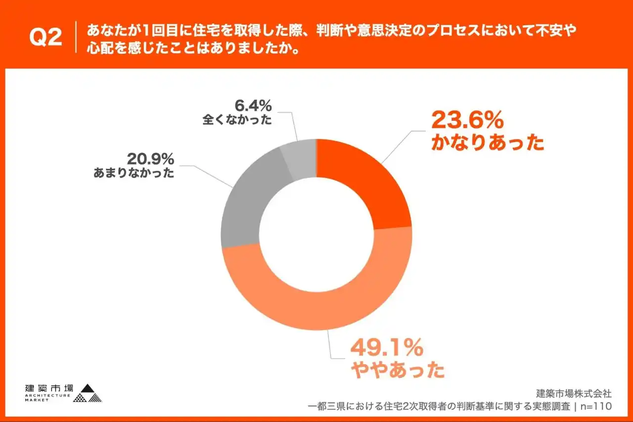 「Q2. あなたが1回目に住宅を取得した際、判断や意思決定のプロセスにおいて不安や心配を感じたことはありましたか。」(n=110)と質問したところ、「かなりあった」が23.6%、「ややあった」が49.1%という回答となりました。 |